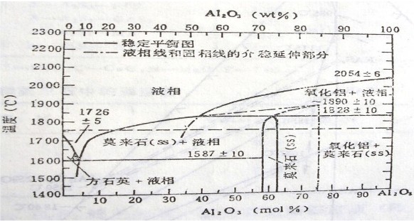 當A12O3超過71.8%,從平衡狀態圖1850 ℃以下沒有液相出現,穩定的晶相是莫來石與剛玉。 1850℃以上,則出現液相與高溫穩定的剛玉結晶相。有耐火度高,荷重軟化溫度高等優良高溫作業性能。