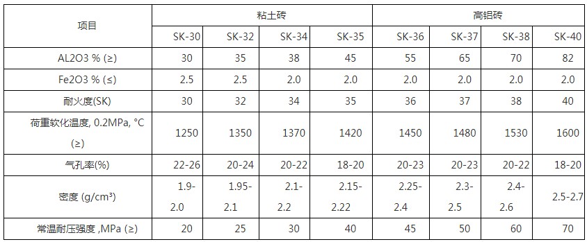 下面介紹下SK32、SK34、SK36、SK38、SK40耐火磚的理化指標。